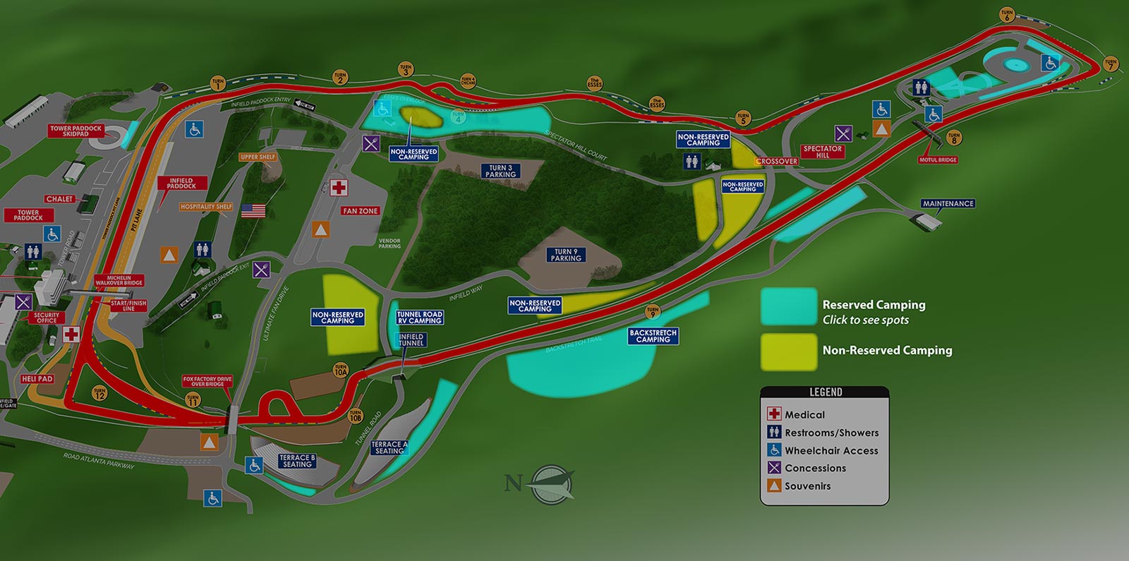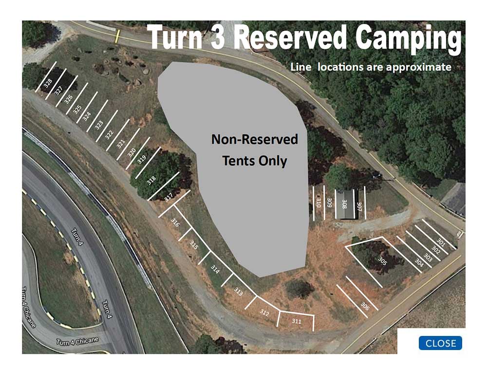 Non-Reserved Tent/RV camping located Turn 5 Bathhouse, Turn 9 Infield, Turn 10 Infield. Non-Reserved RV/Tent areas are first come first serve upon arrival.